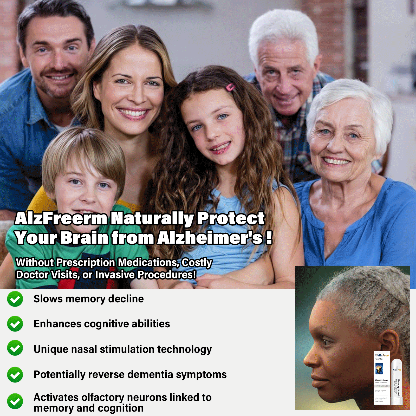 Unlike traditional oral medications or injections, AlzFree™ uses a non-invasive nasal inhaler, whicheliminates the risks and discomfort often associated with pills and injections. Itsall-natural formula ensures a gentle andeffective approach to brain health.